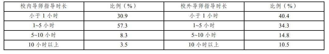 从指导时长来看,57.3%的校内导师每周指导时长在1~5小时,每周指导时长为5~10小时和10小时以上的校内导师占比分别为8.3%和3.5%;34.3%的校外导师每周指导时长在1~5小时,每周指导时长为5~10小时和10小时以上的校外导师占比分别为14.8%和10.5%。仍有30.9%的校内导师和40.4%的校外导师每周指导时长不足1小时(见表9)。