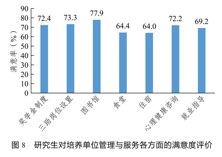在培养单位管理与服务各方面中,研究生对图书馆的满意度最高(满意率为77.9%),其他依次为“三助”岗位设置、奖学金制度、心理健康咨询、就业指导,食堂和住宿满意率最低,分别为64.4%和64.0%(见图8)。
