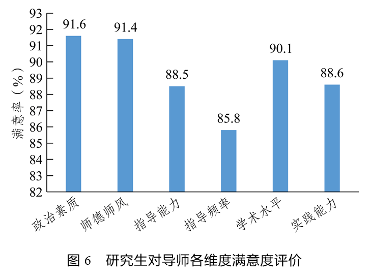 在指导教师能力素养方面,研究生对导师政治素养和师德师风的满意度较高,满意率分别为91.6%和91.4%;对导师指导频率的满意度最低,满意率仅为85.8%(如图6所示)。