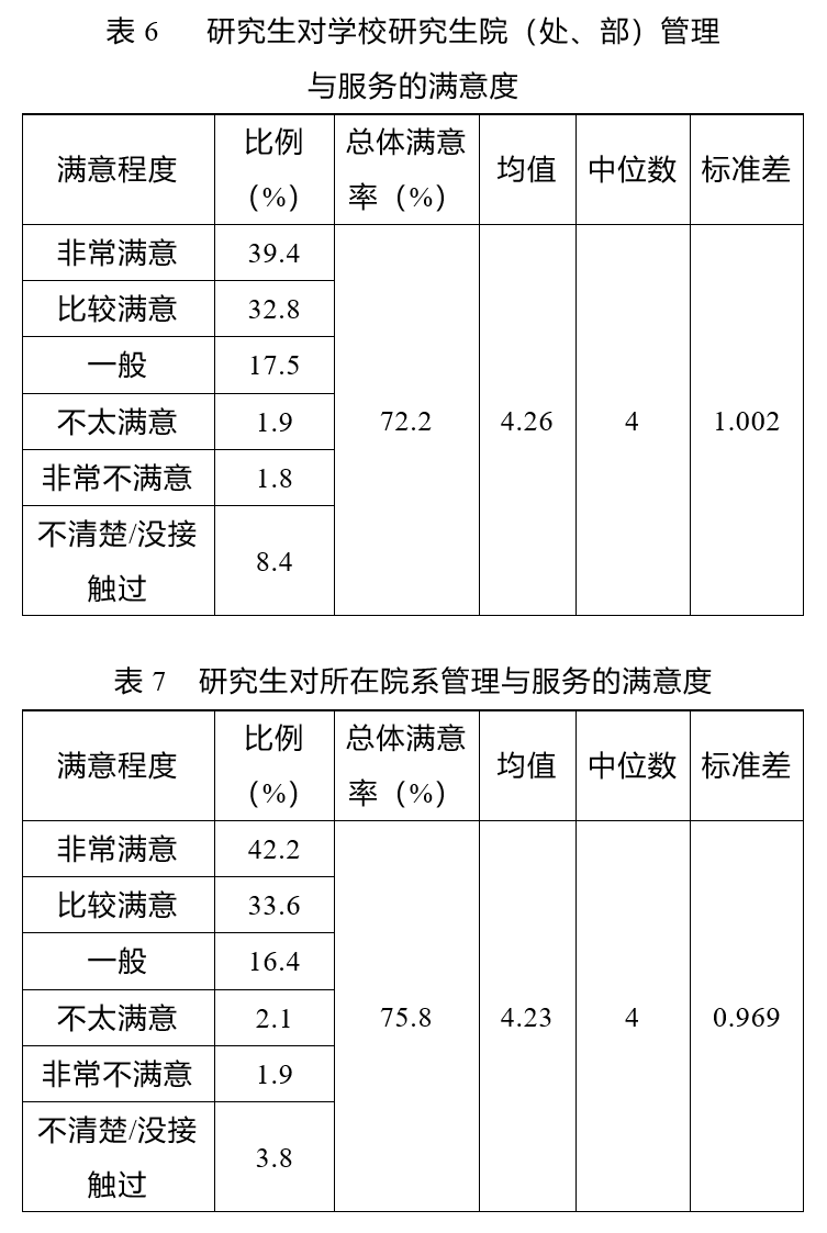 研究生对院系管理与服务的满意度高于对研究生院(处、部)的满意率,对培养单位的研究生院(处、部)管理与服务的满意率为72.2%(见表6),对所在院系管理与服务的满意率为75.8%(见表7)。