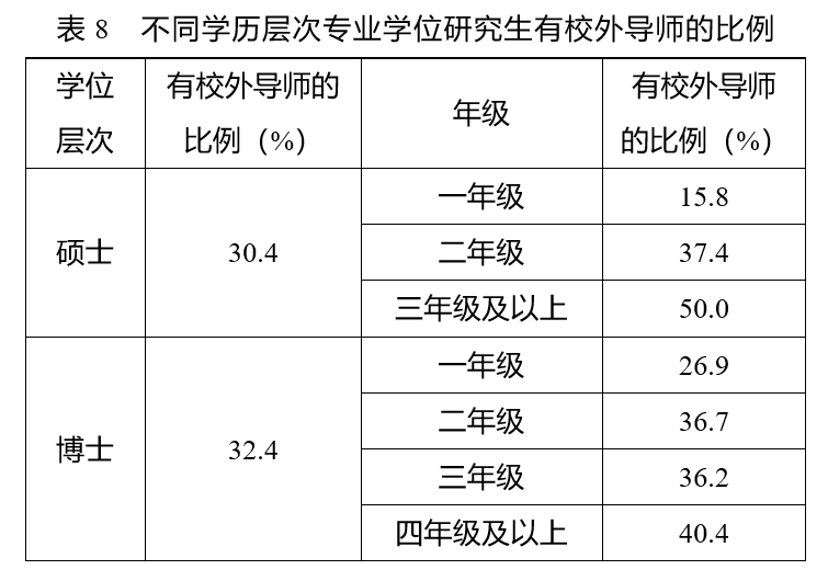 在校外导师数量方面,2024年,有校外导师的专业学位研究生占专业学位研究生总数的比例为30.4%。虽然较之2023年有所提高,但这一占比总体依旧偏低。从年级分布来看,高年级专业学位研究生有校外导师的比例明显高于低年级专业学位研究生。具体来看,三年级及以上有校外导师的专业学位硕士生占比50.0%,四年级及以上有校外导师的专业学位博士生比例为40.4%(见表8)。有校外导师的专业学位研究生对校外导师的满意率为90.6%,其中,专业学位博士生对校外导师的满意率为94.2%,专业学位硕士生对校外导师的满意率为90.7%