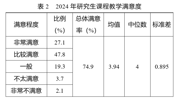 研究生对课程教学的满意率为74.9%,比总体满意率低0.8个百分点(见表2)。
