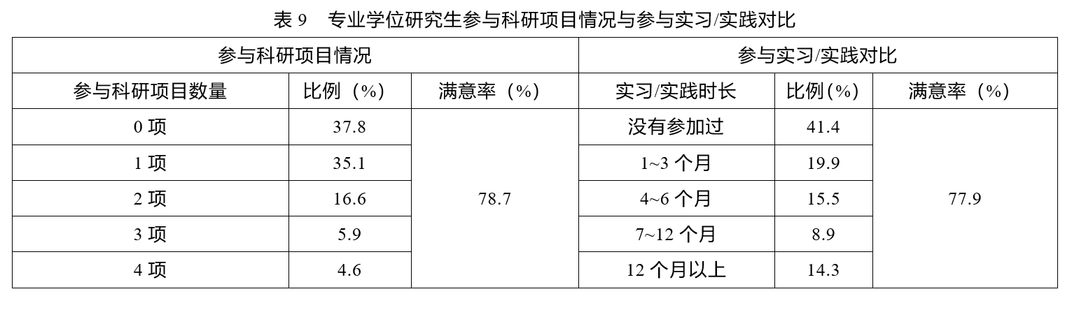 在科研项目参与方面,62.2%的专业学位研究生参加过科研项目。其中,参加过1项科研项目的专业学位研究生占比35.1%,参加过2项科研项目的专业学位研究生占比16.6%,而参加过3项和4项科研项目的专业学位研究生占比最少,分别为5.9%与4.6%。专业学位研究生对参加科研项目的总体满意率为78.7%,其中专业学位博士生对参与科研项目的满意率高达84.6%,而专业学位硕士生的满意率明显较低,仅为78.4%。