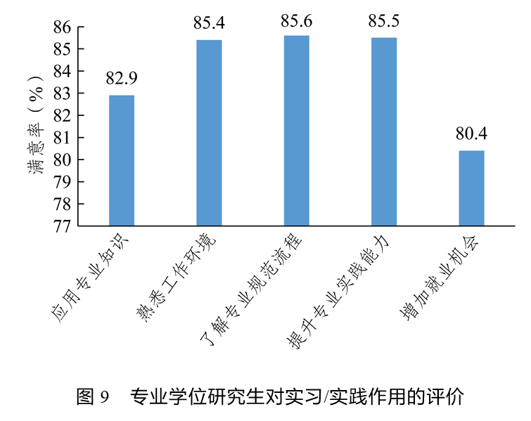 专业学位研究生对实习/实践的效果普遍较为满意。具体来看,专业学位研究生对了解专业规范流程的满意率最高(85.6%),其他依次为提升专业实践能力(85.5%)、熟悉工作环境(85.4%)、应用专业知识(82.9%),对实习和实践活动增加就业机会的满意率最低(80.4%)(见图9)。此外,专业学位博士生对实习/实践效果的满意率(82.2%)明显高于专业学位硕士生(77.7%)。