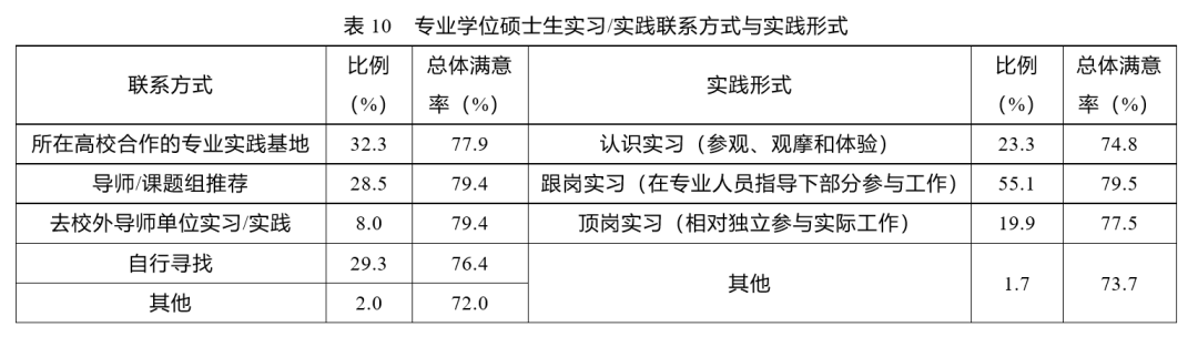 与所在高校合作的专业实践基地联系、自行寻找、导师/课题组推荐是专业学位研究生寻找实习/实践单位的主要方式。如表10所示,在各类实习/实践单位中,专业学位研究生对导师/课题组推荐的实习/实践单位以及校外导师单位的满意率最高(79.4%),对与所在高校合作的专业实践基地满意率(77.9%)次之,对自行寻找的实习/实践单位的满意率相对较低,只有76.4%。在实践形式方面,55.1%的专业学位研究生进行了跟岗实习,23.3%的学生进行了认识实习,19.9%的学生进行了顶岗实习。其中,满意率最高的实践形式是跟岗实习(79.5%),77.5%的学生对顶岗实习表示满意,而认识实习的满意率相对较低,只有74.8%。