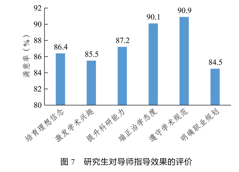 从指导效果来看,研究生对导师指导帮助自身遵守学术规范和端正治学态度的作用的满意度较高,满意率分别为90.9%和90.1%,对导师指导帮助自身明确职业规划的作用的满意率最低(84.5%)。对其他方面作用的满意率由高到低依次为提升科研能力(87.2%)、培育理想信念(86.4%)、激发学术兴趣(85.5%)(如图7所示)。