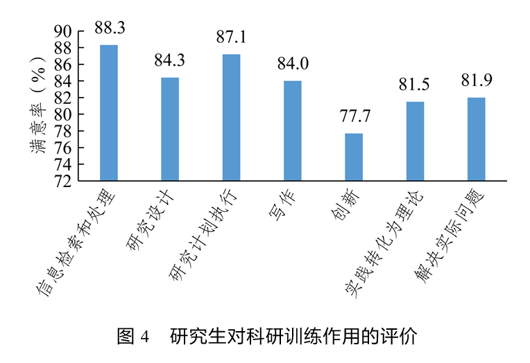 研究生高度认可科研训练对于自身能力提升的作用。研究生对科研训练在提升自己信息检索和处理能力方面的作用的满意率最高,高达88.3%,其他方面的作用满意率由高到低依次为研究计划执行能力(87.1%)、研究设计能力(84.3%)、写作能力(84.0%)、解决实际问题能力(81.9%)、将实践问题转化为理论问题能力(81.5%)。研究生对科研训练在提升自己创新能力方面的作用的满意率最低,仅为77.7%(见图4)。