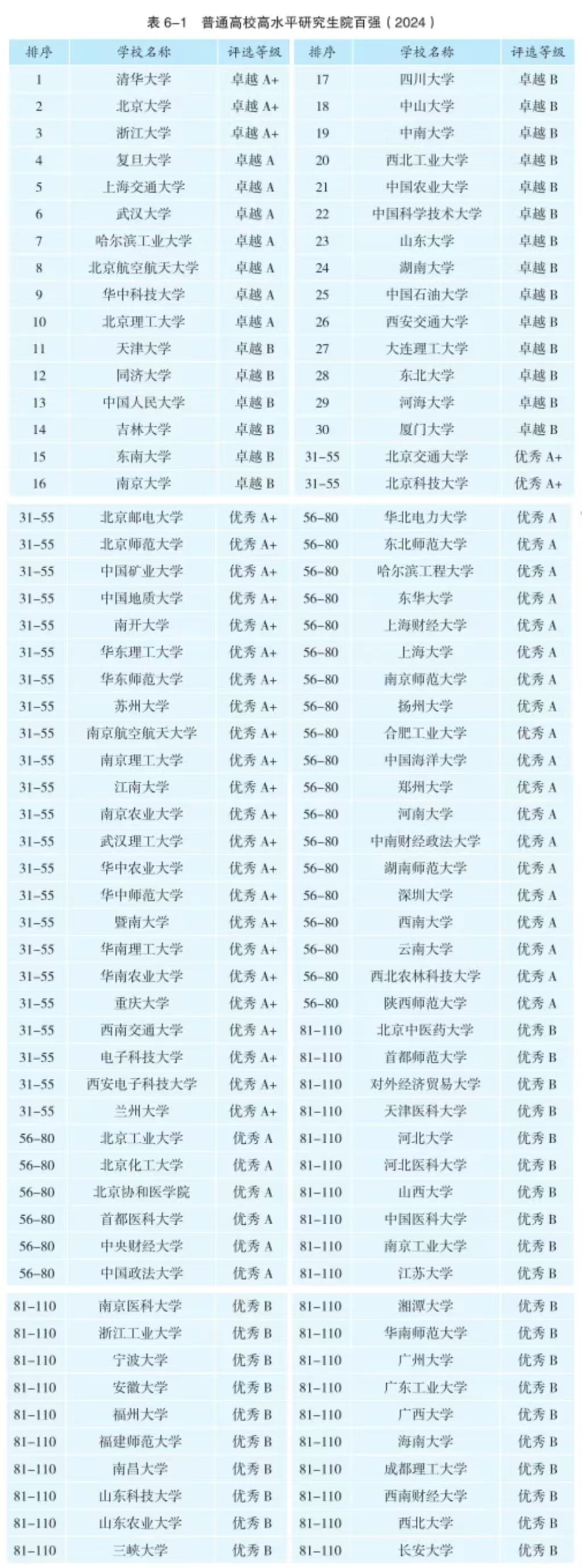 高水平研究生院百强旨在评选出 100 所左右高水平的研究生院。2024 年评选评价了 622 所高等学校研究生院。鉴于排序位次越靠后,高校得分值越接近,入选 2024 年的高水平研究生院百强高校总计有 110 所,这与 2023 年一致。110所研究生院百强分为卓越 A+、卓越 A、卓越 B、优秀 A+、优秀 A、优秀 B共6个档次。(见图片)